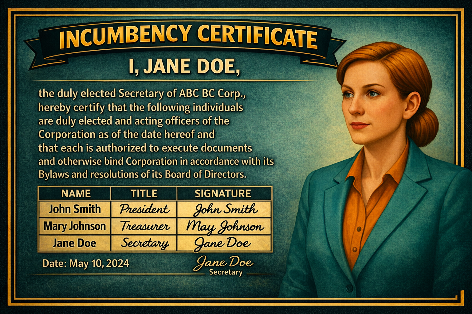 “I, Jane Doe, the duly elected Secretary of ABC Corp., hereby certify that the following individuals are duly elected and acting officers of the Corporation as of the date hereof, and that each is authorized to execute documents and otherwise bind the Corporation in accordance with its Bylaws and resolutions of its Board of Directors.”